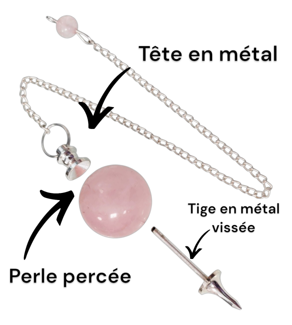 La perle et le pendule, tous deux taillés dans la même pierre naturelle, comportent un perçage central permettant d'insérer et de visser une tige en métal, garantissant ainsi solidité et durabilité.