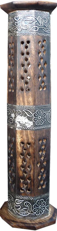 Porte encens tour en bois 3 bandes métal ciselées 30cm