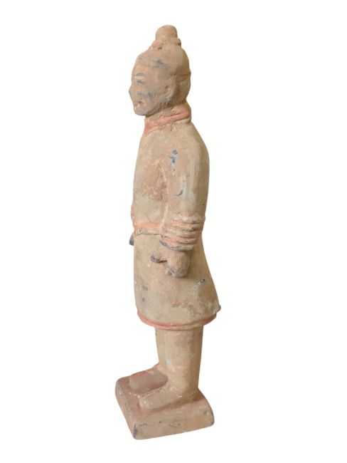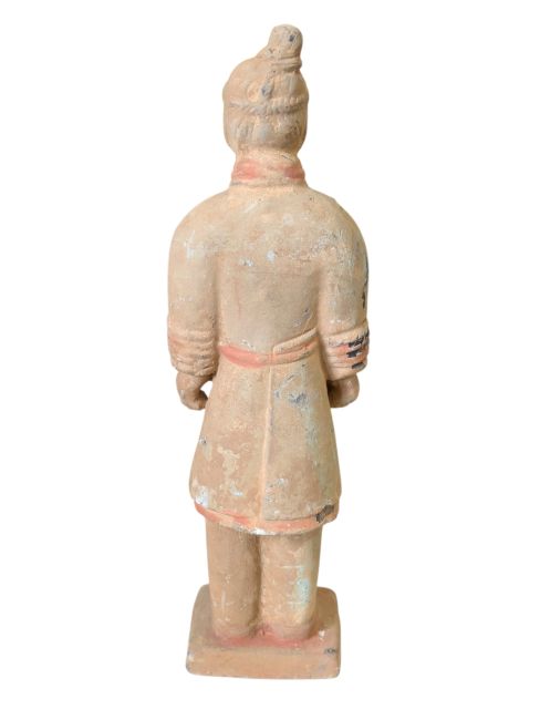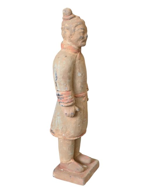 Guerrier en tenue de combat : Ces statues représentent une des catégories de soldats parmi les statues de l'armée de terre cuite. Ils sont généralement représentés comme des soldats vêtus de tenues de combat simples. Comparés à d'autres types de guerriers en terre cuite, ils ont souvent moins d'équipement et de décorations. Ces soldats étaient probablement des fantassins ordinaires, chargés de tâches de garde et autres missions militaires générales, plutôt que des commandants supérieurs ou des membres de troupes spéciales. Leur représentation pourrait refléter l'image typique des soldats ordinaires dans l'armée de la Chine antique, avec des tenues simples mais un courage et une détermination inébranlables.