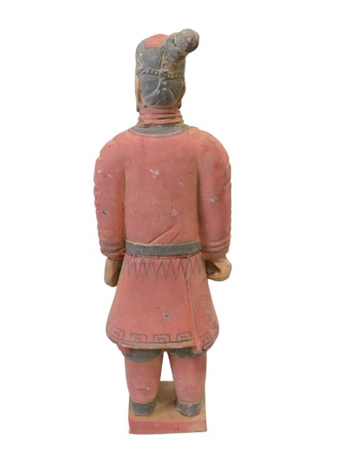 Guerrier en tenue de combat : Ces statues représentent une des catégories de soldats parmi les statues de l'armée de terre cuite. Ils sont généralement représentés comme des soldats vêtus de tenues de combat simples. Comparés à d'autres types de guerriers en terre cuite, ils ont souvent moins d'équipement et de décorations. Ces soldats étaient probablement des fantassins ordinaires, chargés de tâches de garde et autres missions militaires générales, plutôt que des commandants supérieurs ou des membres de troupes spéciales. Leur représentation pourrait refléter l'image typique des soldats ordinaires dans l'armée de la Chine antique, avec des tenues simples mais un courage et une détermination inébranlables.