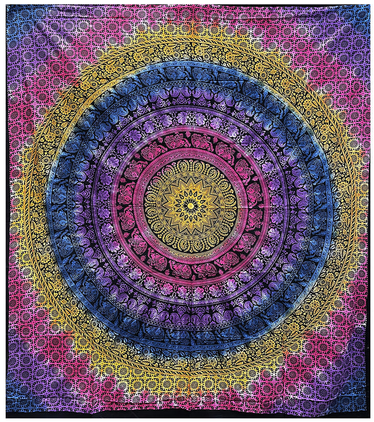 Tenture Mandala Eléphant Mauve Jaune Bleu Rose