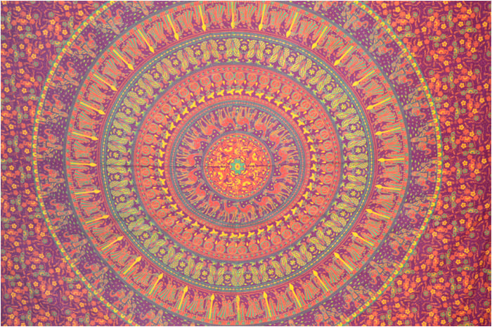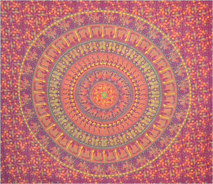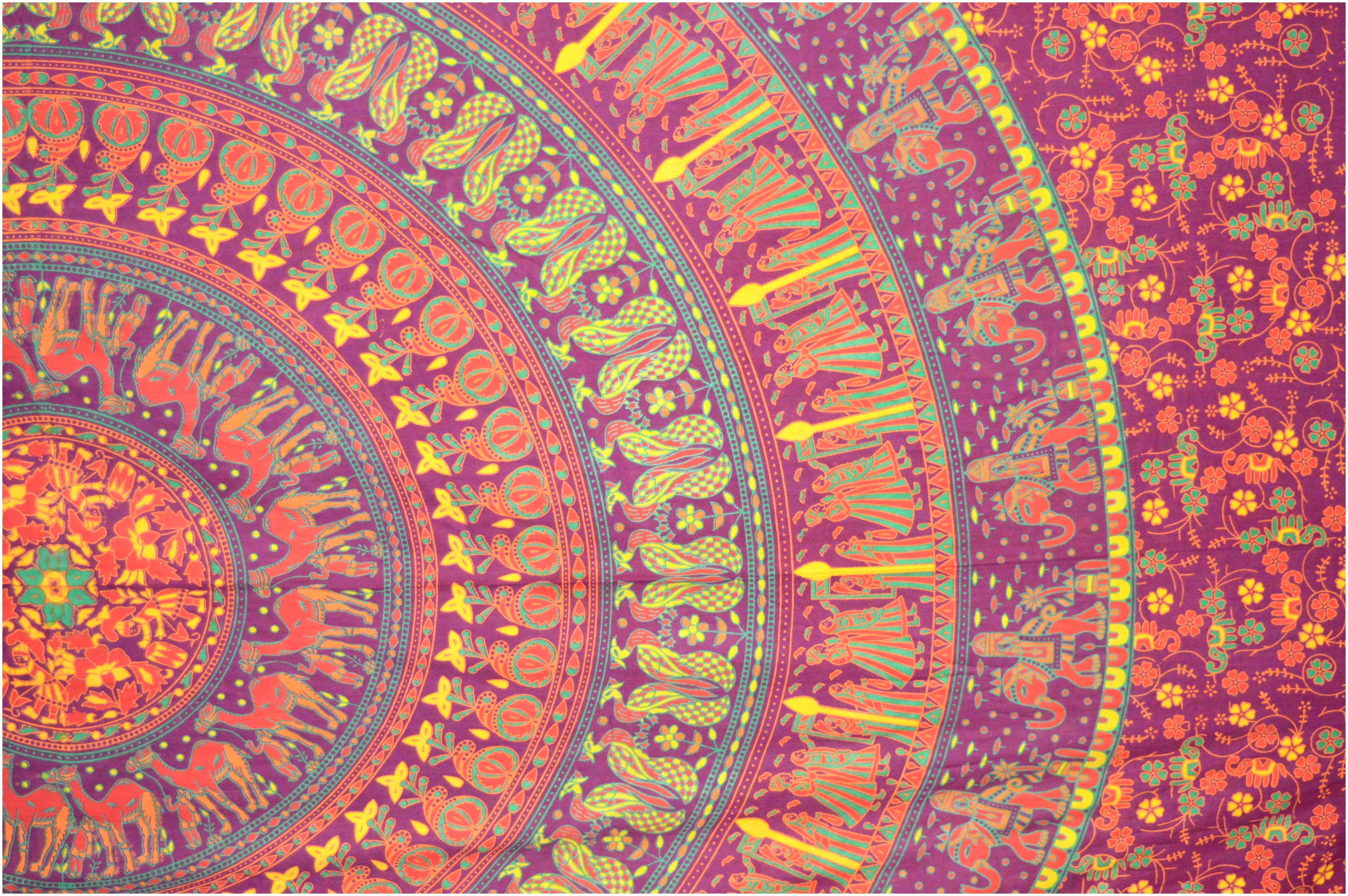 Tenture mandala elephants & chameaux bordeaux orange vert et jaune